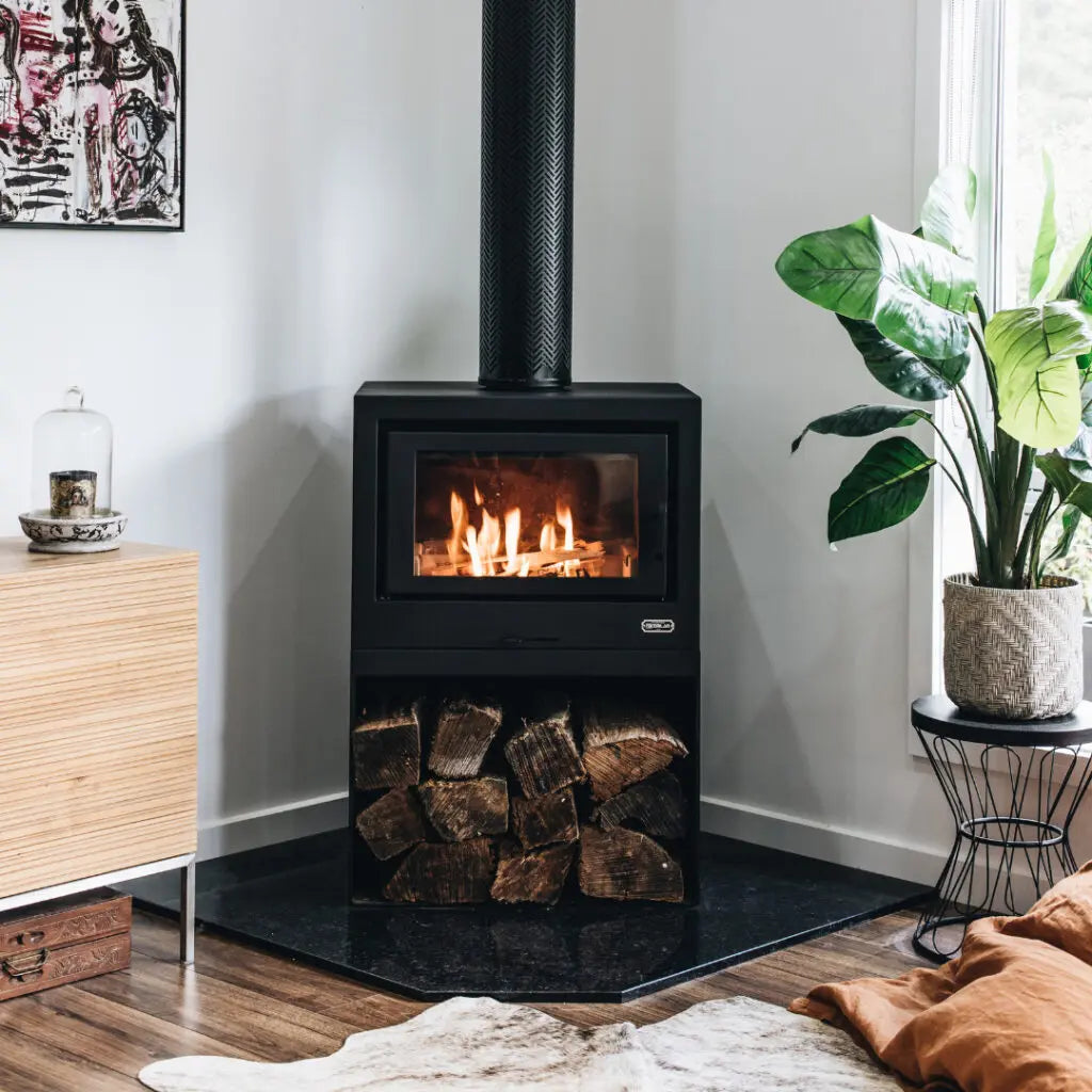 The Kemlan Cube freestanding wood fireplace combines clean effective heating with sleek minimalist design.